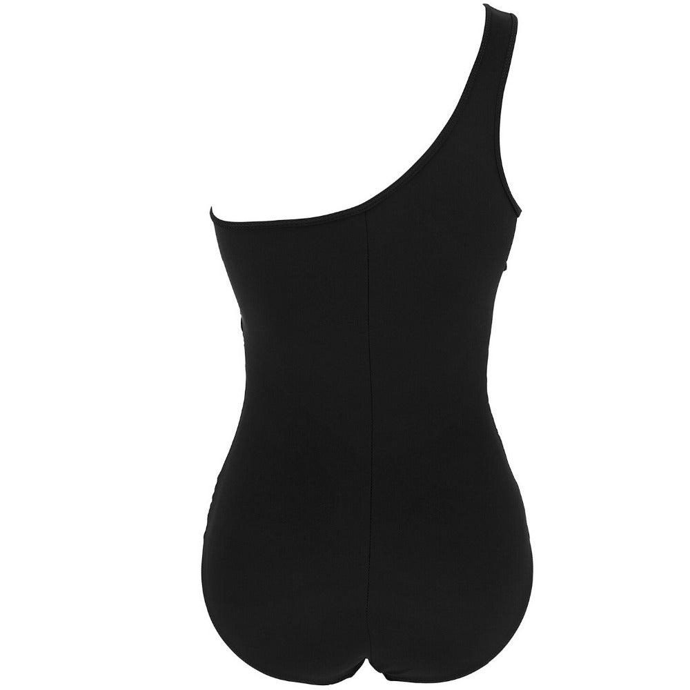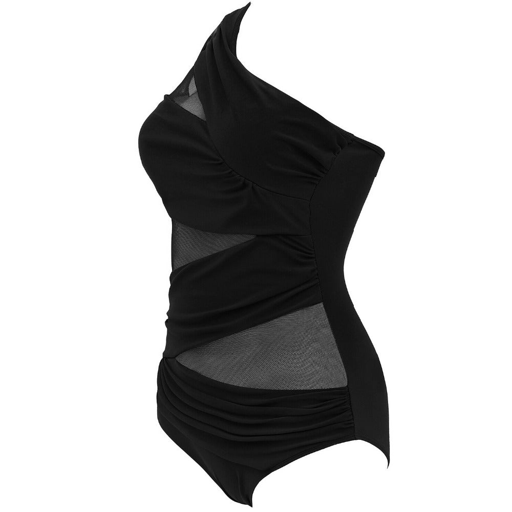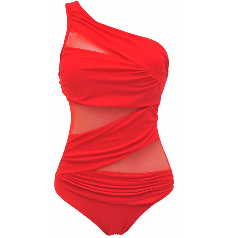 A sexy single shoulder mesh one piece swimsuit for plus size women. The padding provides support and coverage. The material in the front where your skin is visible, whichlike a veil could make your curves.
